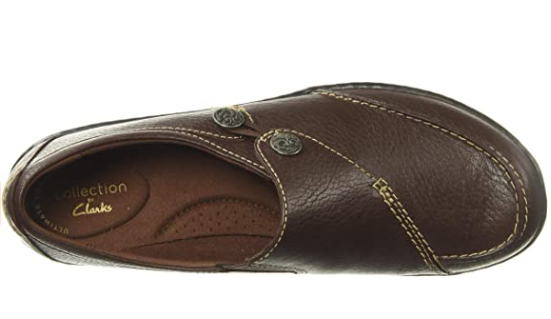 The classic slip-on from the Clarks collection offers ultimate wearability, crafted in supple leather with a trendy low-top. Very comfortable, with stretch gore, fabric lining and ultra-flexible, lightweight tpr outsole. This women's shoe is a great choice for professional or casual wear.