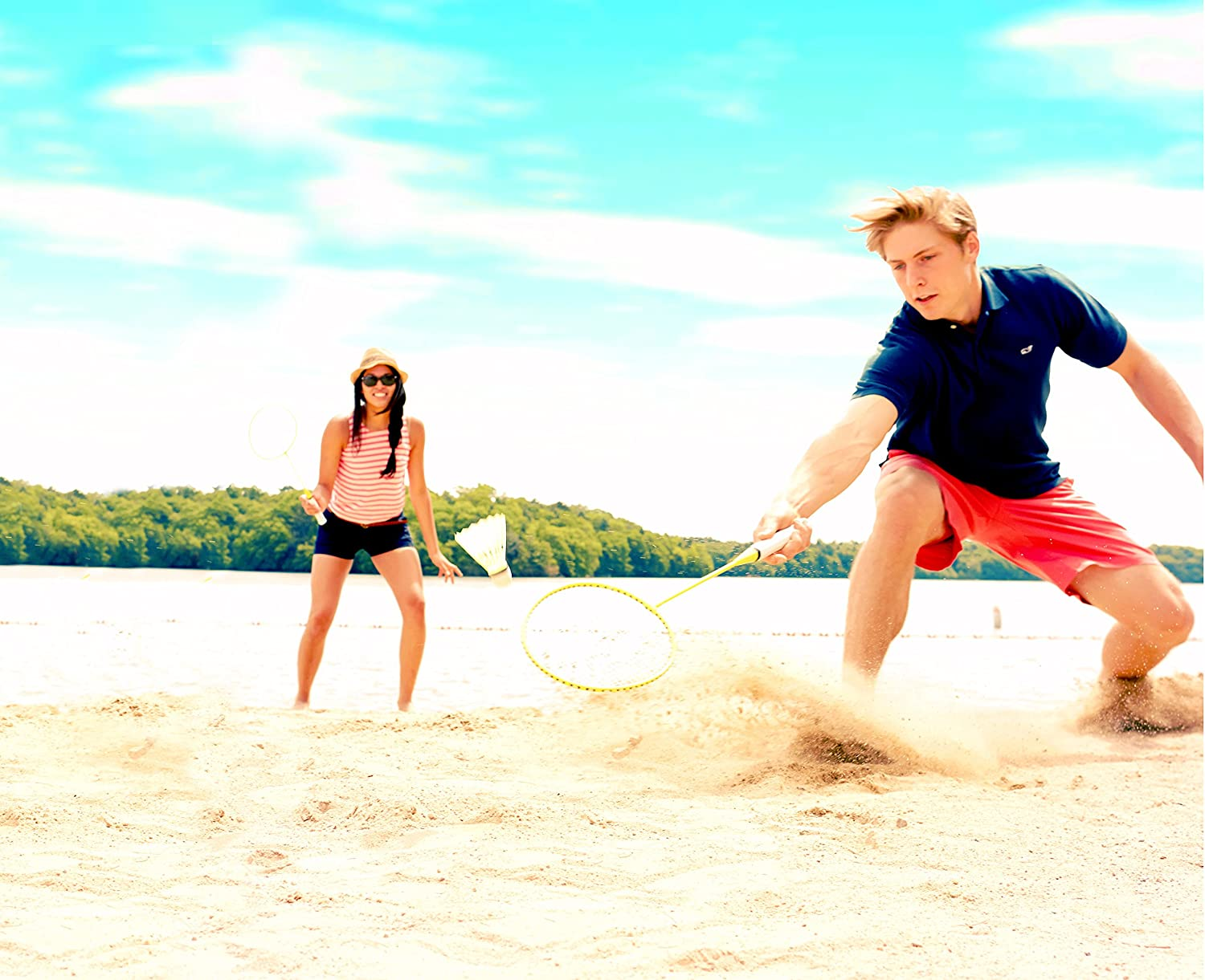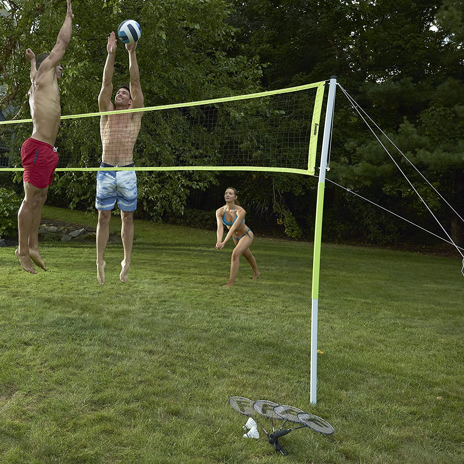 • INCLUDES: (4) "Tight String" tempered steel racquets with "soft-touch" padded grip and (2) A-grade shuttlecocks are included to allow for multiple players, (1) Volleyball and (1) Pump